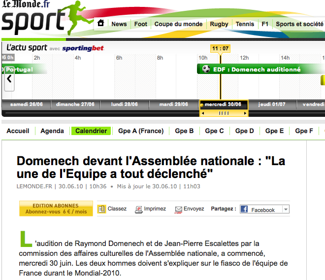 Ce matin du 30 juin, donc le choix de quelques journalistes en formation est de traiter du football français. Leur point de départ : l’audition de Raymond Domenech et Jean-Pierre Escalette devant la Commission des affaires culturelles de l’Assemblée nationale. A priori, il ne fallait pas attendre grand chose de cette séance, Raymond Domenech ayant obtenu que cette audition, qui devait être initialement retransmise par La Chaîne Parlementaire et Eurosport, se déroule à huis-clos.